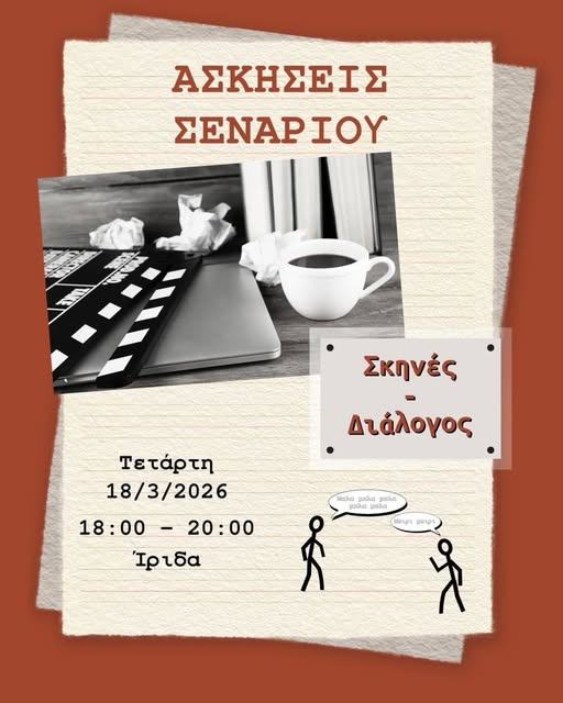 Το Σάββατο 14 Μαρτίου 2026, 3μμ, Ίριδα, οι Ασκήσεις Σκηνοθεσίας παρουσιάζουν την ενότητα: Από το σενάριο στη σκηνοθεσία, μέρος Α’: Βασικές αρχές σεναρίου και σκηνοθετική πραγμάτωση μέσα από συγκεκριμένα παραδείγματα.