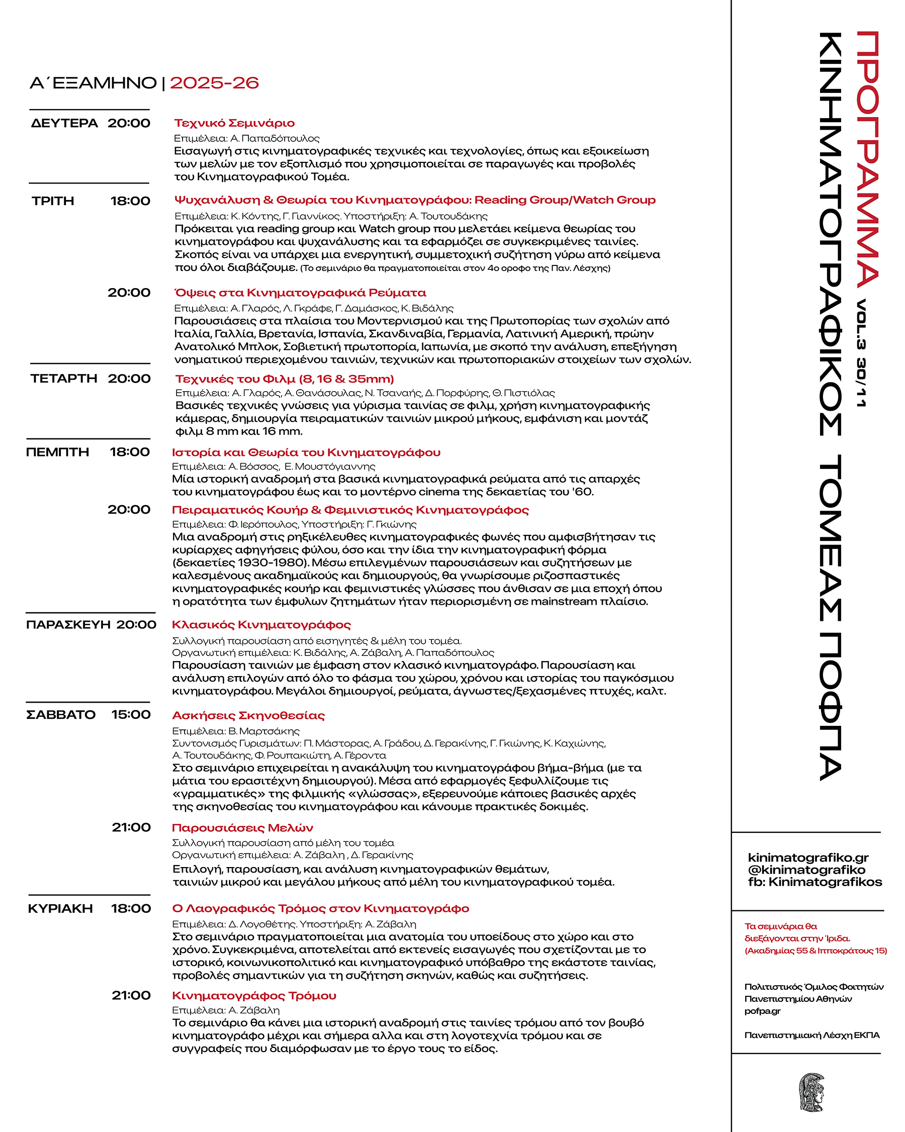 Λόγω ζητημάτων προγραμματισμού της Παν.Λέσχης, τα βραδινά σεμινάρια τις καθημερινές (Τρίτη-Παρασκευή) αλλάζουν ώρα έναρξης και θα ξεκινούν στις 20.00. Συγκεκριμένα, η αλλαγή ώρας έναρξης αφορά τα τα σεμινάρια: Όψεις στα Κινηµατογραφικά Ρεύµατα, Τεχνικές του Φιλµ (8, 16 & 35mm), Πειραµατικός Κουήρ & Φεµινιστικός Κινηµατογράφος, Κλασικός Κινηµατογράφος, το οποία αντί για τις 21.00, θα ξεκινούν πλέον στις 20.00.
