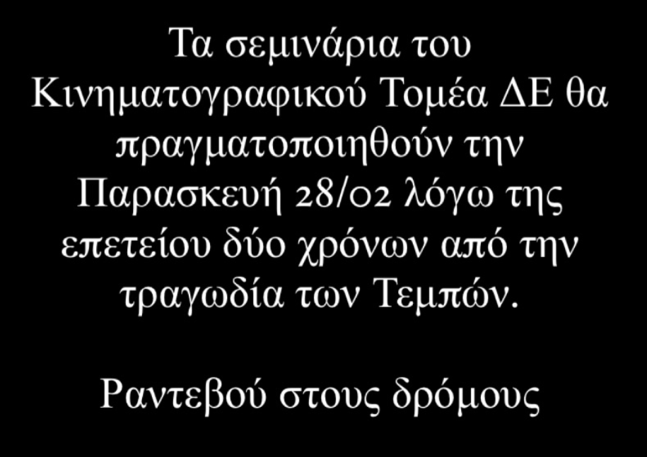 Ιστορία & Θεωρία του Κινηματογράφου- Πέμπτη 27/2 Τελικά σήμερα το σεμινάριο θα πραγματοποιηθεί στις 19.00 στην Ίριδα… ̶Σ̶ή̶μ̶ε̶ρ̶α̶ ̶τ̶ο̶ ̶σ̶ε̶μ̶ι̶ν̶ά̶ρ̶ι̶ο̶ ̶θ̶α̶ ̶π̶ρ̶α̶γ̶μ̶α̶τ̶ο̶π̶ο̶ι̶η̶θ̶ε̶ί̶ ̶σ̶τ̶ι̶ς̶ ̶1̶9̶.̶0̶0̶ ̶σ̶τ̶ο̶ ̶κ̶τ̶ί̶ρ̶ι̶ο̶ ̶Κ̶ω̶σ̶τ̶ή̶ς̶ ̶Π̶α̶λ̶α̶μ̶ά̶ς̶/̶Ρ̶ο̶ζ̶ ̶κ̶τ̶ί̶ρ̶ι̶ο̶,̶ ̶(̶π̶ε̶ζ̶ό̶δ̶ρ̶ο̶μ̶ο̶ς̶ ̶Σ̶ί̶ν̶α̶ ̶&̶a̶m̶p̶;̶ ̶Α̶κ̶α̶δ̶η̶μ̶ί̶α̶ς̶ ̶4̶8̶)̶.̶