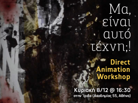 Το ‘Animation: A Modern Retrospective’ και το ‘Τεχνικό σεμινάριο’ διοργανώνουν από κοινού workshop επάνω στο direct animation (ζωγραφική σε φιλμ 35mm), αυτή την Κυριακή 08/12 στις 16:30, στο χώρο της Ίριδας (Ακαδημίας 55, Αθήνα).