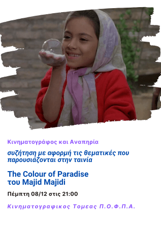 Τη Πέμπτη 8 Δεκεμβρίου στις 21.00 μμ θα μιλήσουμε για την ταινία ‘Το χρώμα του Παραδείσου / Rang-E Khoda ‘ του ιρανού Ματζίντ Ματζιντί, γυρισμένη το 1999. Η ταινία προτάθηκε για Όσκαρ καλύτερης ξενόγλωσσης ταινίας και διακρίθηκε σε πολλά φεστιβάλ. Ο σκηνοθέτης καταφέρνει να φανερώσει τη σοβαρότητα, τους φόβους και την αθωότητα της παιδικής ηλικίας μέσα από την ιστορία ενός τυφλού αγοριού. Ο θεατής γίνεται συνταξιδιώτης στο συναισθηματικό ταξίδι ενός παιδιού που ποθεί να “δει” τον Θεό.