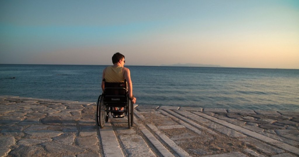 Στο πάνω μέρος : Με φόντο το λιμάνι, βλέπουμε τον Γρηγόρη σε αμαξίδιο που έχει φτάσει μέχρι τη θάλασσα και αγναντεύει το ηλιοβασίλεμα.