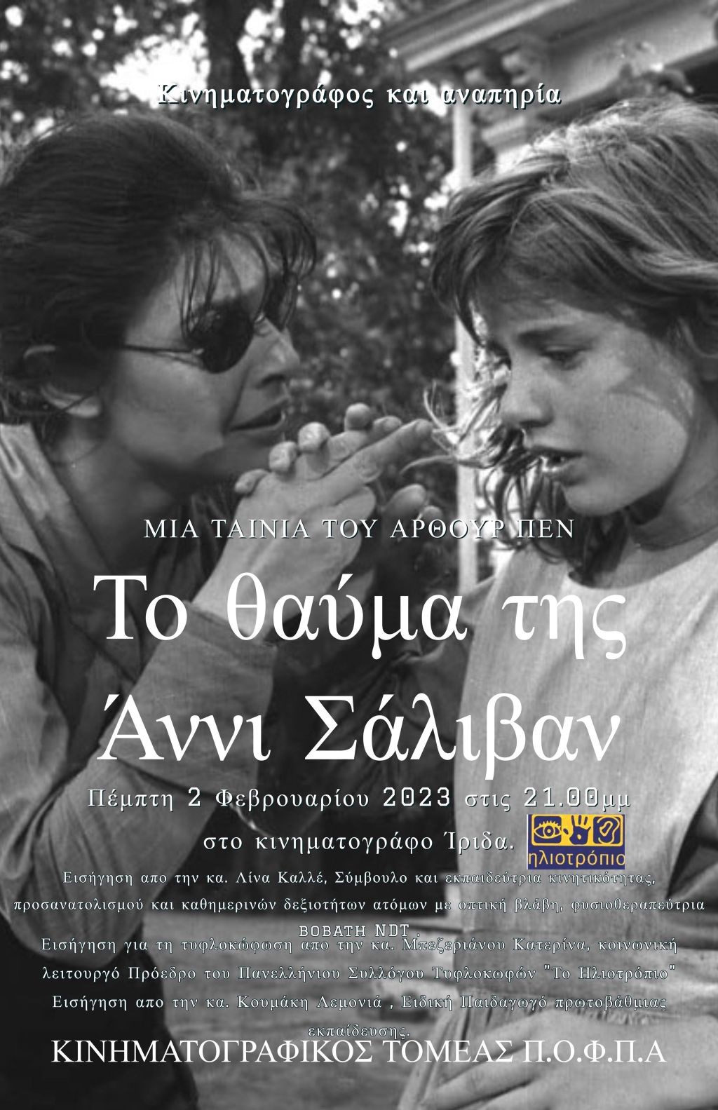 Τη Πέμπτη 2 Φεβρουαρίου στις 21.00 μμ θα μιλήσουμε για τις θεματικές της ταινίας ‘Το θαύμα της Άννι Σάλιβαν /The Miracle Worker’ του Άρθουρ Πεν. Η ταινία είναι βασισμένη στη ‘θεατρική βιογραφία’ του Αμερικανού συγγραφέα Ουίλλιαμ Γκίμπσον, αναφερόμενος σε ένα υπαρκτό πρόσωπο την Έλεν Κέλερ. Η Έλεν απο δεκαεννιά μηνών, έχασε την όραση, την ακοή και τη λαλιά της. Μέσα από την επίπονη προσπάθεια της παιδαγωγού Άνι Σάλιβαν, η Έλεν θα αποκτήσει μέθοδο επικοινωνίας με το περιβάλλον και θα πάρει τη ζωή στα χέρια της. Η Έλεν Άνταμς Κέλερ ήταν τυφλοκωφή Αμερικανίδα συγγραφέας, πολιτική ακτιβίστρια και λέκτορας. Βραβεία Όσκαρ Α’ και Β’ Γυναικείου ρόλου στις Αν Μπάνκροφτ και Πάτι Ντιουκ.