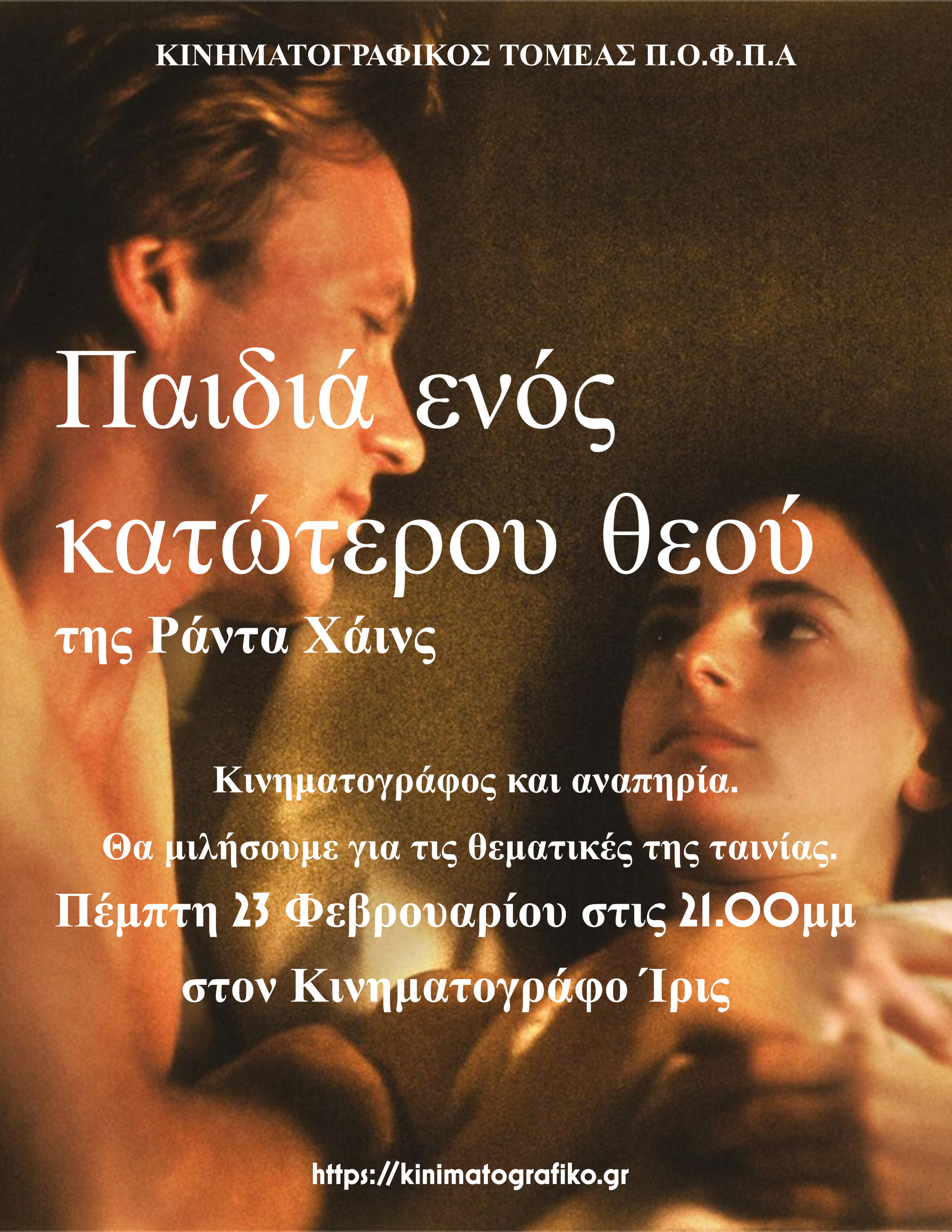 Την Πέμπτη 23 Φεβρουαρίου 2023 στις 21.00μμ θα μιλήσουμε για τις θεματικές της ταινίας ‘Παιδιά ενός κατώτερου θεού / Children of a Lesser God’ σε σκηνοθεσία της Ράντα Χάινς, γυρισμένη το 1986.