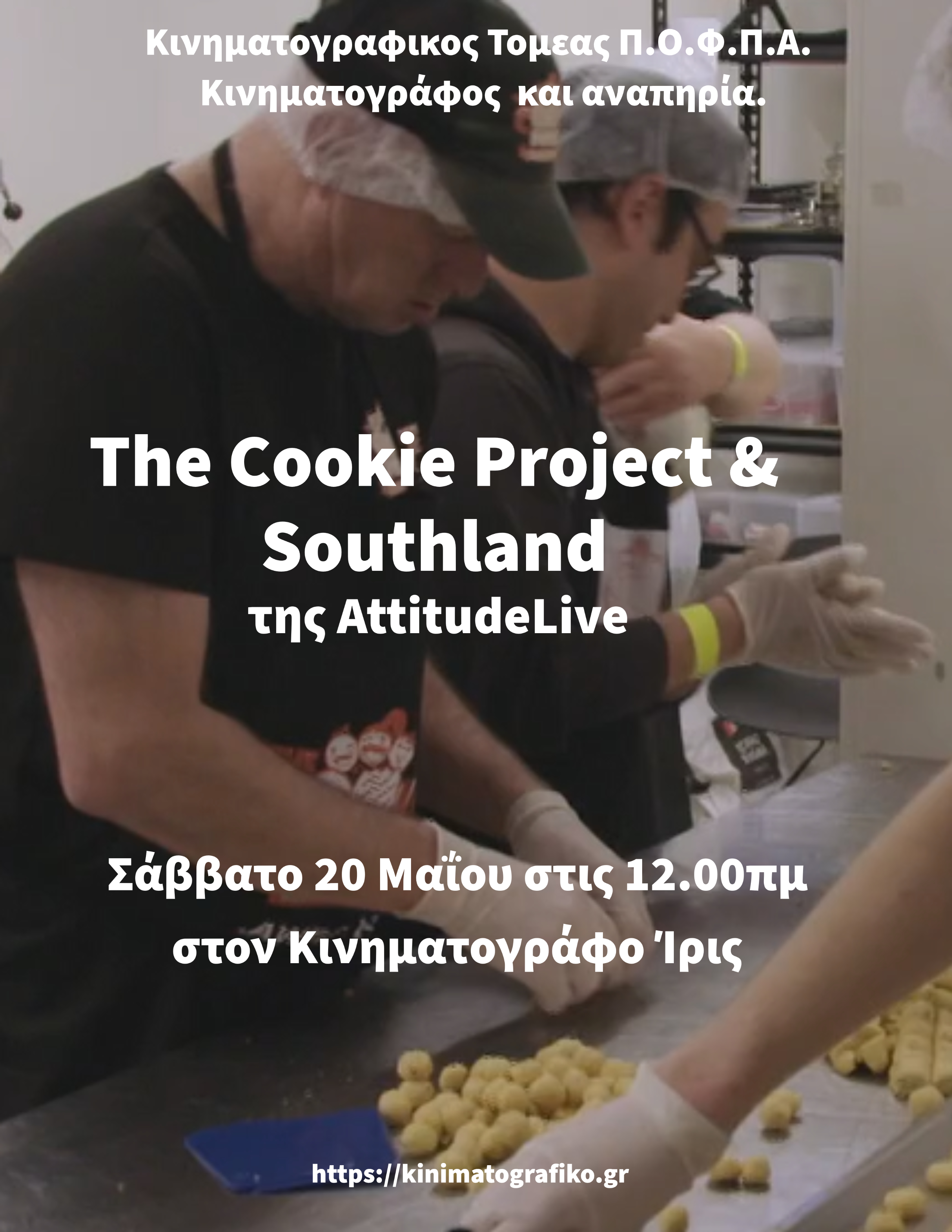 Στο μέσον αναγράφεται με λευκά γράμματα : ‘The Cookie Project & Southland’ της AttitudeLive’. Από κάτω αναγράφεται με λευκά γράμματα : ‘Σάββατο 20 Μαΐου στις 12.00πμ στον Κινηματογράφο Ίρις’