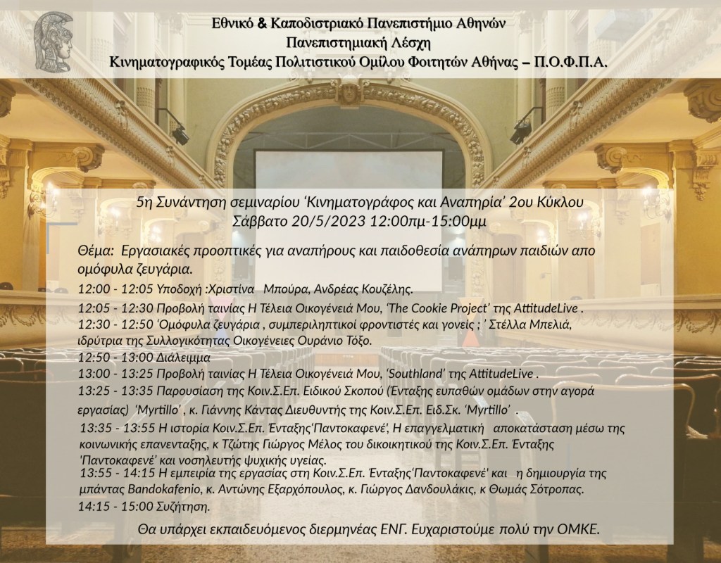 Μετά τη πρώτη ταινία θα ακολουθήσει η εισήγηση «Ομόφυλα ζευγάρια , συμπεριληπτικοί φροντιστές και γονείς ; » απο τη Στέλλα Μπελιά, ιδρύτρια της Συλλογικότητας Οικογένειες Ουράνιο Τόξο.