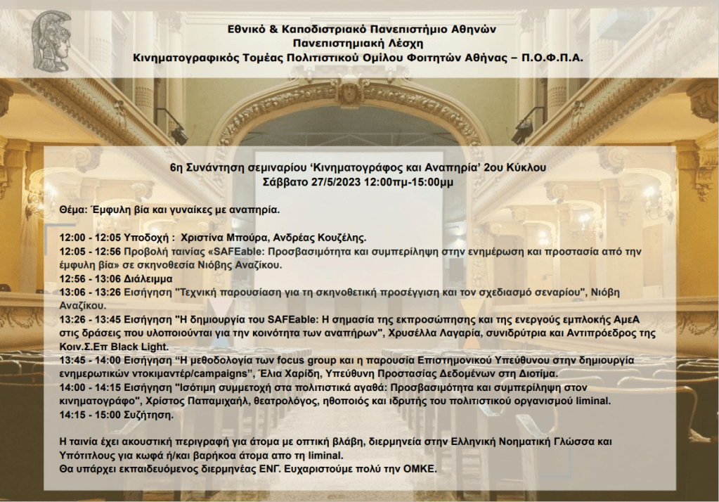 Το Σάββατο 27 Mαϊου 2023 12:00πμ-15:00μμ θα υλοποιηθεί η 6η Συνάντηση του σεμιναρίου ‘Κινηματογράφος και Αναπηρία’ 2ου Κύκλου με θέμα «Έμφυλη βία και γυναίκες με αναπηρία».