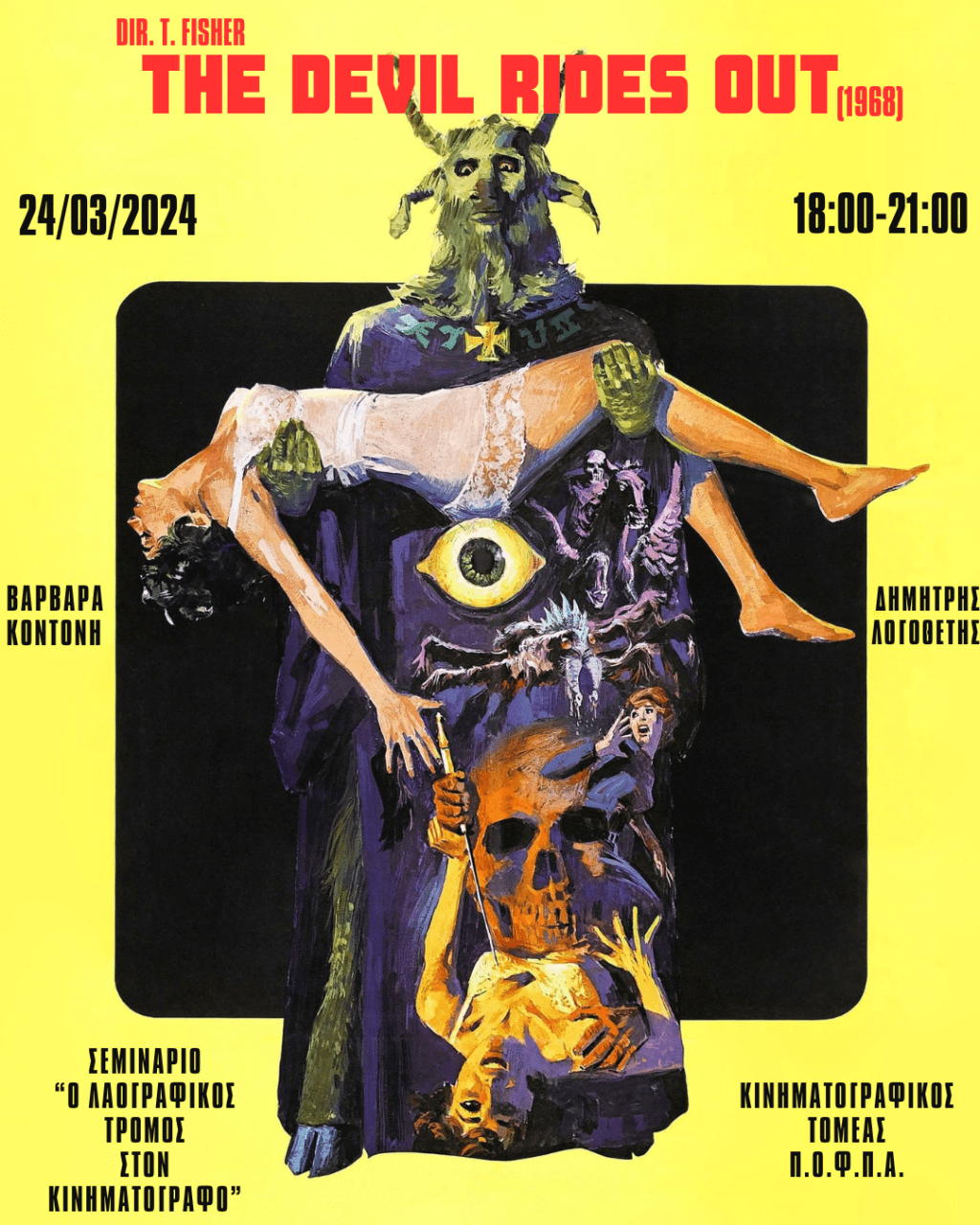Το σεμινάριο «Ο Λαογραφικός Τρόμος στον Κινηματογράφο» και ο Κινηματογραφικός Τομέας του Π.Ο.Φ.Π.Α. εξετάζουν στις 24.03.2024 (18:00 μ.μ.) τις μαγικοθρησκευτικές σέκτες κατά τη διάρκεια του μεσοπολέμου και την επιβίωση της δαιμονολατρίας στους κόλπους των ανώτερων τάξεων μέσω της ταινίας The Devil Rides Out (1968) Terence Fisher.