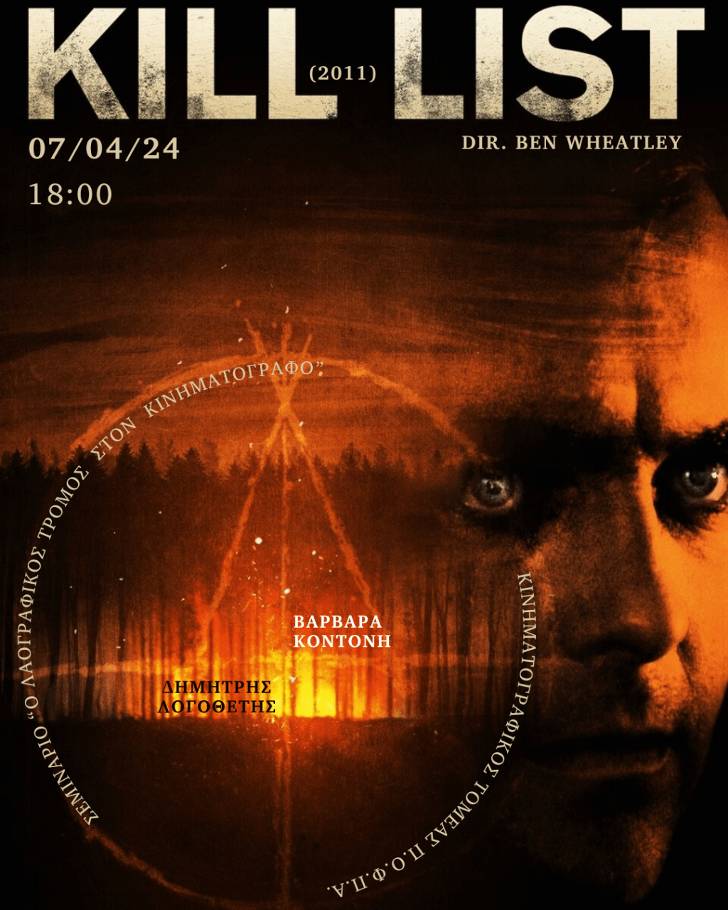 Το σεμινάριο «Ο Λαογραφικός Τρόμος στον Κινηματογράφο» και ο Κινηματογραφικός Τομέας του Π.Ο.Φ.Π.Α. στις 07.04.2024 (18:00 μ.μ.) εξετάζουν τις παγανιστικές δοξασίες που επιβιώνουν στην επαρχία και τη θέση τους στον συλλογικό φαντασιακό και το σύγχρονο κινηματογράφο, μέσω της ταινίας Kill List (2011) του Ben Weatley.
