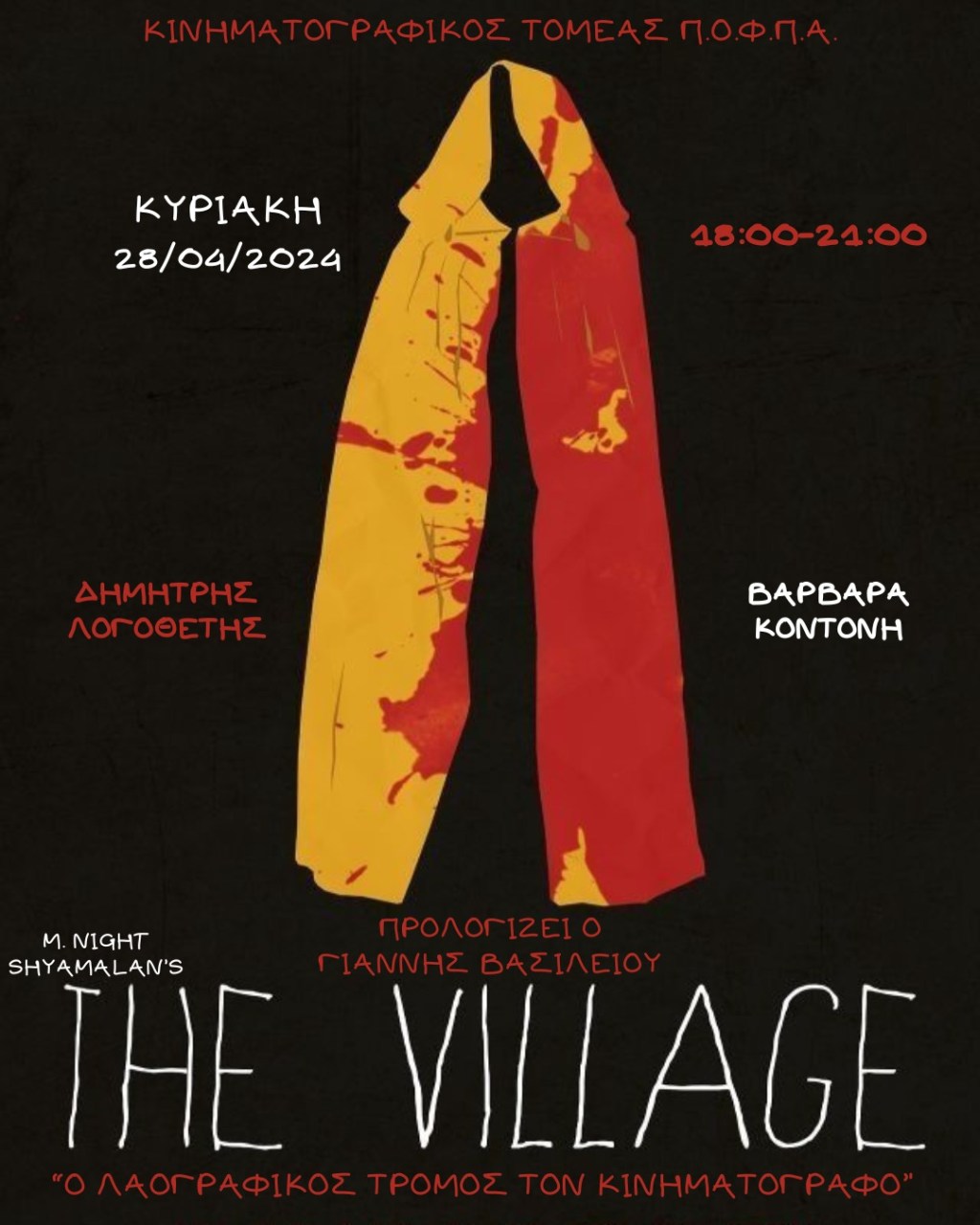 Το σεμινάριο «Ο Λαογραφικός Τρόμος στον Κινηματογράφο» και ο Κινηματογραφικός Τομέας του Π.Ο.Φ.Π.Α. εξετάζουν στις 28.04.2024 (18:00 μ.μ.) τις συνέπειες του να ζει κανείς σε έναν κόσμο προαποφασισμένα αλλιώτικο, έναν προσεκτικά καμωμένο επίγειο Παράδεισο με μια Κόλαση ολόγυρά του, μέσα από την ταινία The Village (2004) του M. Night Shyamalan. Προλογίζει ο κριτικός κινηματογράφου Γιάννης Βασιλείου.