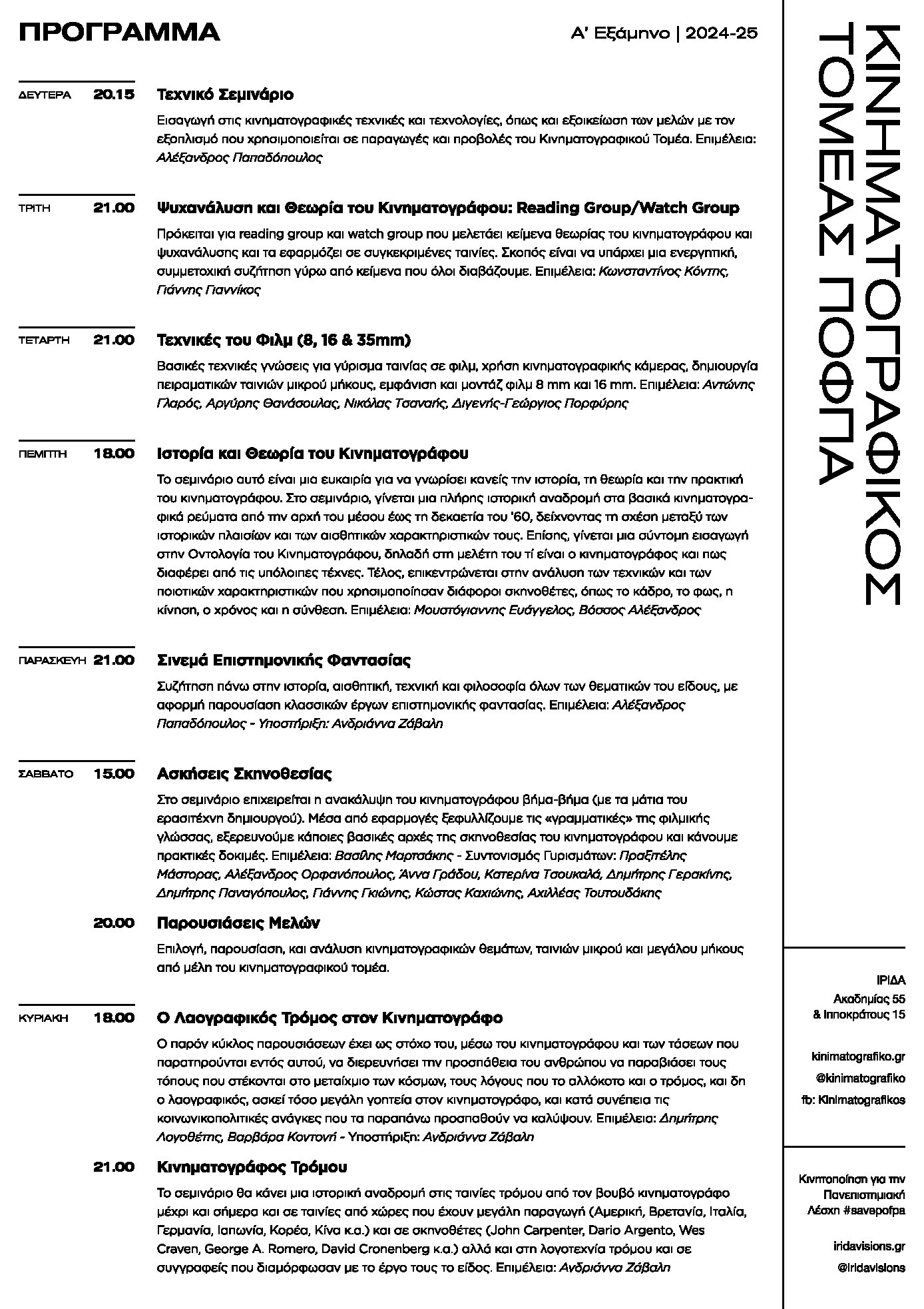 Το τακτικό πρόγραμμα σεμιναρίων ξεκινάει για το φετινό ακ.έτος την Τετάρτη 30/10 στις 21.00, με την πρώτη συνάντηση των Τεχνικών του Φιλμ (8,16 & 35mm).