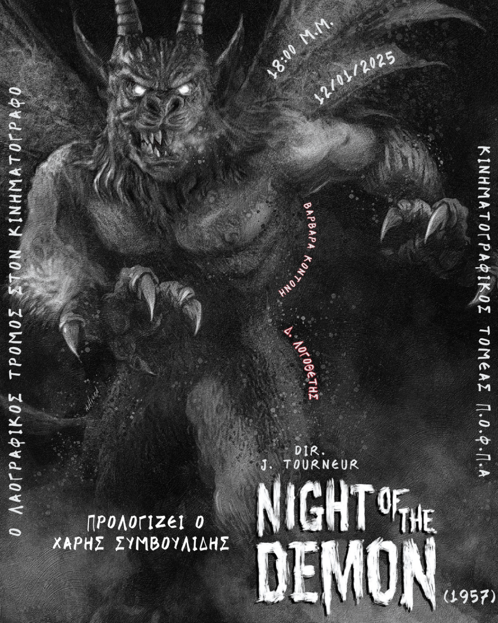 Το σεμινάριο «Ο Λαογραφικός Τρόμος στον Κινηματογράφο» και ο Κινηματογραφικός Τομέας του Π.Ο.Φ.Π.Α. στις 12/01/25 (18:00 μ.μ.) εξετάζουν τη παγανιστική μαγεία του αγγλοσαξονικού χώρου μέσα από την ταινία του Jacques Tourneur, Night of the Demon (1957). Προλογίζει ο συγγραφέας και μουσικοκριτικός, Χάρης Συμβουλίδης.