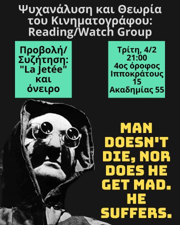Παρουσίαση και συζήτηση: La Jetee και όνειρο στον κινηματογράφο. Τρίτη, 4/2, 4ος όροφος, Ιπποκράτους 15 Ακαδημίας 55.
