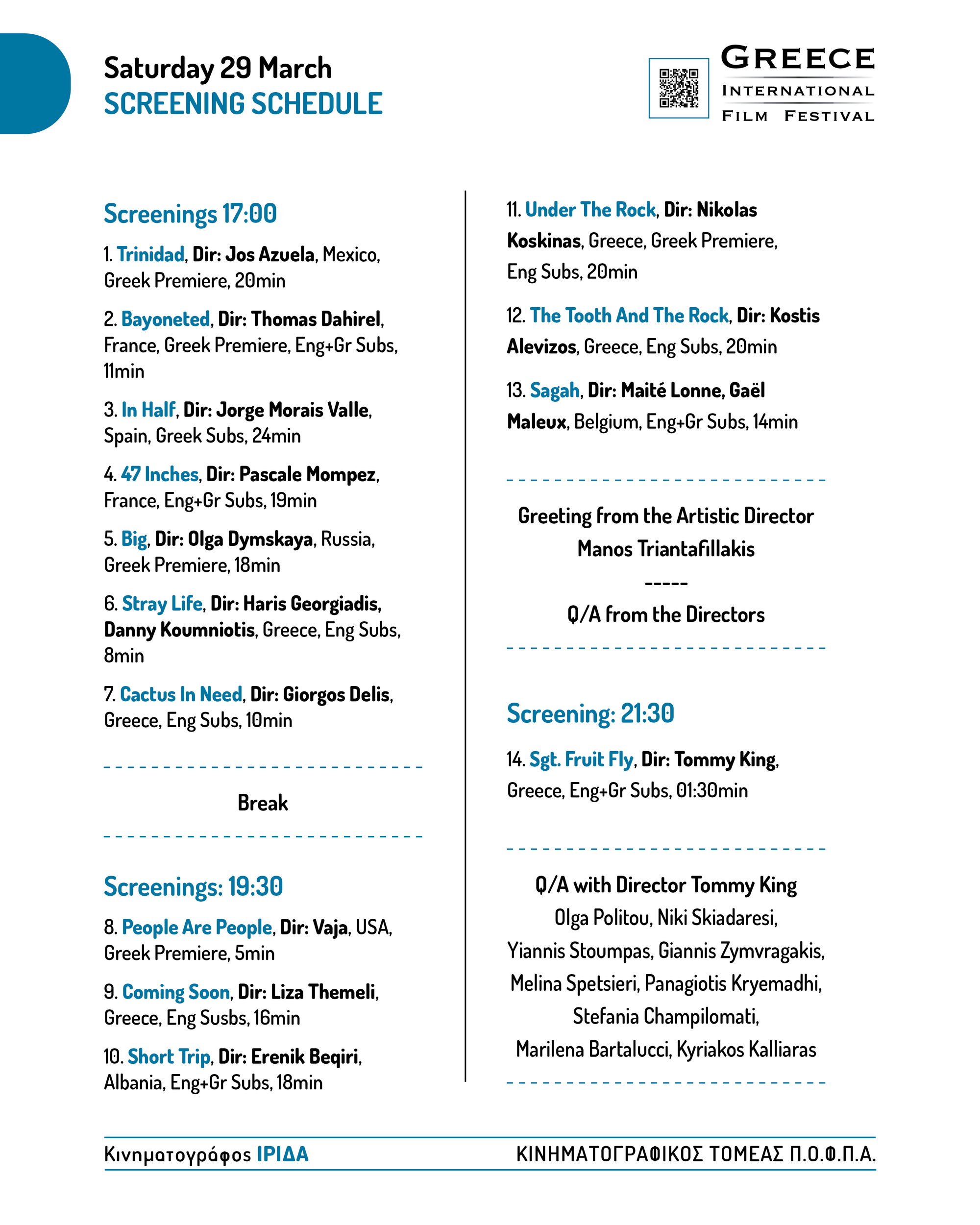 Οι δημιουργοί που θα παρευρεθούν, θα δώσουν συνεντεύξεις (Q & A), μετά την προβολή των ταινιών τους.