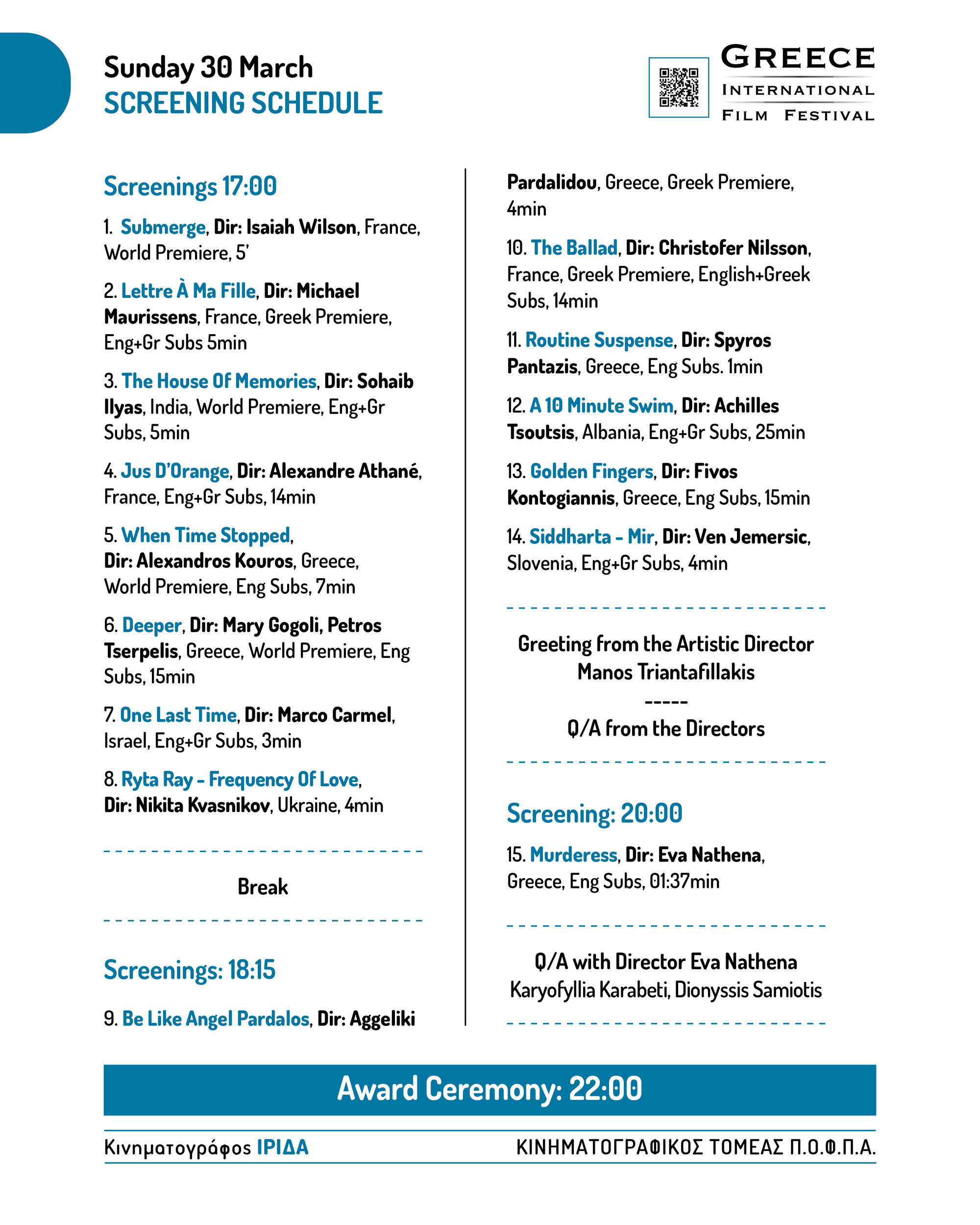 Στις 30 Μαρτίου, θα προβληθεί και η ταινία μεγάλου μήκους “Φόνισσα”. Η σκηνοθέτρια Εύα Νάθενα και οι συντελεστές της επίσης θα μας τιμήσουν με την παρουσία τους και θα υπάρξει ανοικτός διάλογος με το κοινό.