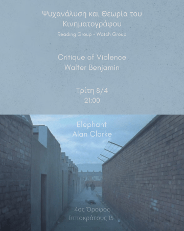 Η έννοια της βίας μέσα από το Critique of Violence του Walter Benjamin και το Elephant του Alan Clarke (θα προβληθεί ολόκληρο).