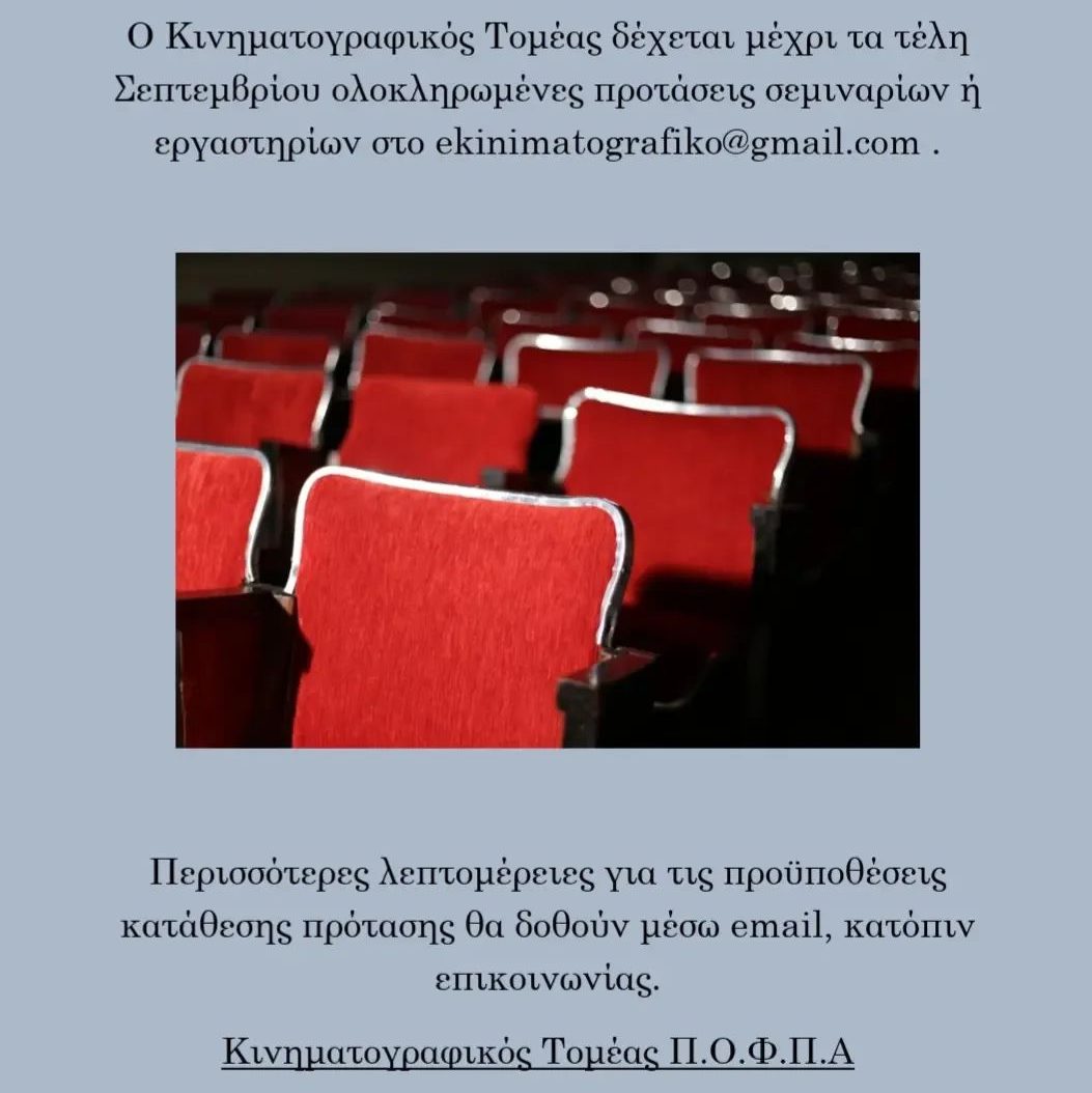 Στο πλαίσιο της διαμόρφωσης του προγράμματος για το ερχόμενο ακαδημαϊκό έτος (2025-26), ο Κινηματογραφικός Τομέας δέχεται μέχρι και τις 17 Σεπτεμβρίου ολοκληρωμένες προτάσεις σεμιναρίων ή εργαστηρίων στο ekinimatografiko@gmail.com.