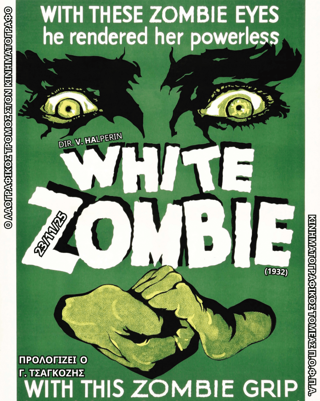 Το σεμινάριο «Ο Λαογραφικός Τρόμος στον Κινηματογράφο» και ο Κινηματογραφικός Τομέας Π.Ο.Φ.Π.Α. στις 23/11/25 (18:00 μ.μ.) εξετάζουν την παράδοση των ζόμπι και τη δουλεία στις Δυτικές Ινδίες, μέσω της ταινίας του Victor Halperin, White Zombie (1932). Προλογίζει ο δημοσιογράφος, Γιώργος Τζαγκόζης.