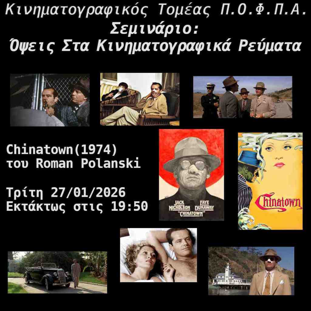 Παρουσίαση : Τα παιγνίδια παρασκηνίου και οι μηχανορραφίες, οι οποίες ορίζουνε και καθορίζουνε τα αναγκαία και το κοινωνικό γίγνεσθαι, υπό το πρίσμα του Roman Polanski στο Chinatown (1974).