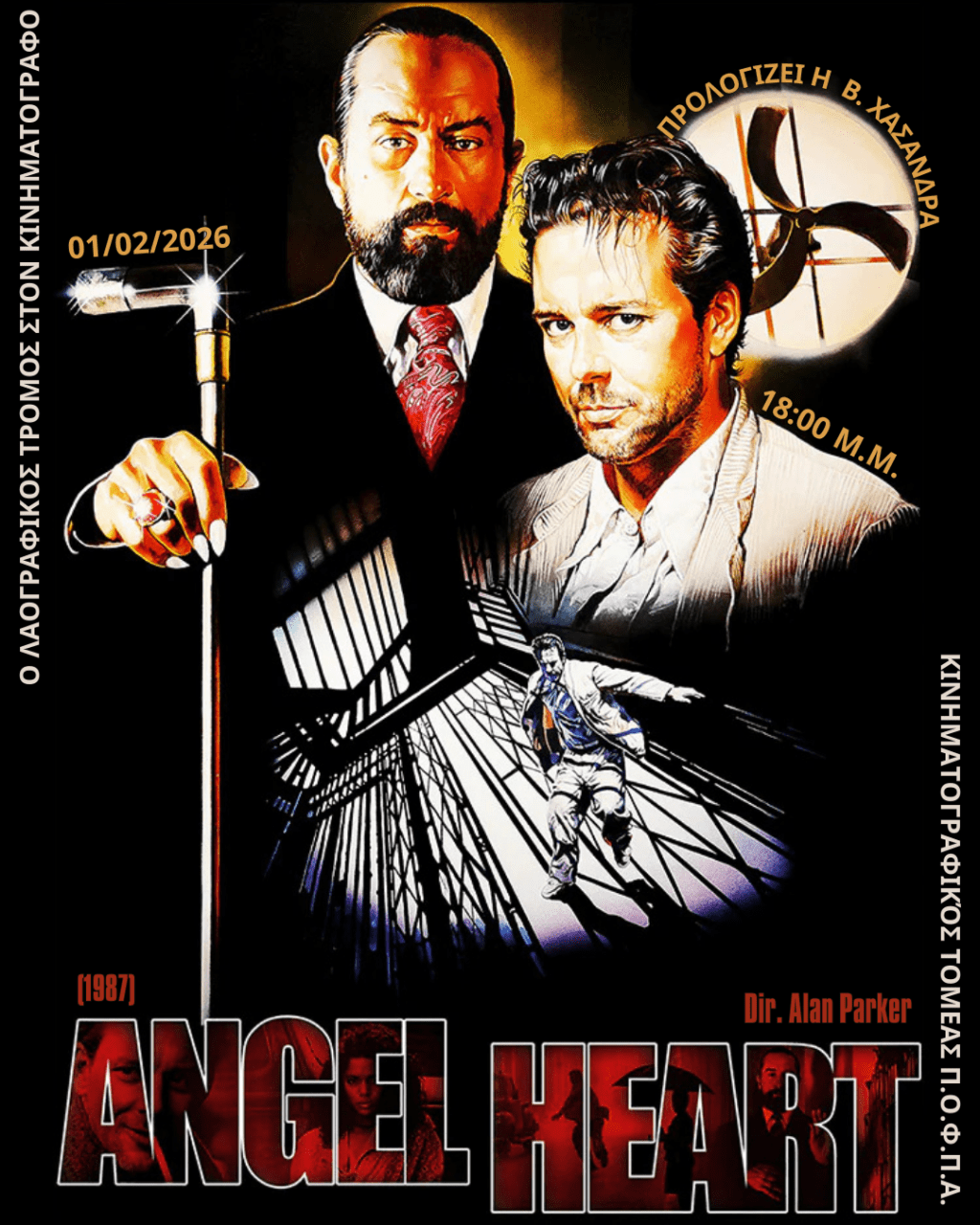 Το σεμινάριο «Ο Λαογραφικός Τρόμος στον Κινηματογράφο» και ο Κινηματογραφικός Τομέας του Π.Ο.Φ.Π.Α. στις 01/02/26 (18:00 μ.μ.) εξετάζουν τη σχέση μεταξύ νουάρ και βουντού, μέσω της ταινίας του Alan Parker, Angel Heart (1987). Προλογίζει η σεναριογράφος, συγγραφέας λογοτεχνίας μυστηρίου και καθηγήτρια του New York College, Βίκυ Χασάνδρα.