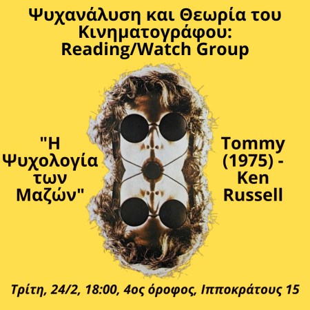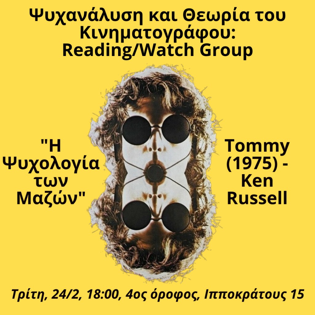 Η ψυχολογία των μαζών με βάση κεφάλαια από το κλασικό κείμενο του Freud και το Tommy (1975) του Ken Russell. Τρίτη, 24/2, 18:00, 4ος όροφος, Ιπποκράτους 15. Το υλικό μπορεί να ζητηθεί στο kinotheoryreading@gmail.com