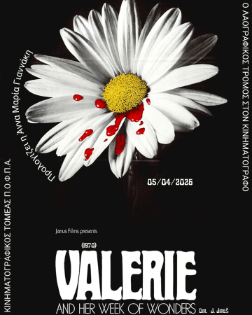Το σεμινάριο «Ο Λαογραφικός Τρόμος στον Κινηματογράφο» και ο Κινηματογραφικός Τομέας του Π.Ο.Φ.Π.Α. στις 05/04/26 (18:00 μ.μ.) εξετάζουν τη σχέση της εφηβείας και των λαογραφικών παραμυθιών μέσω του σουρεαλιστικού αριστουργήματος του Jaromil Jireš, Valerie A Týden Divů (1970). Προλογίζει η ποιήτρια και αρθρογράφος (Cineraporto), Άννα Μαρία Γιαννάκη.