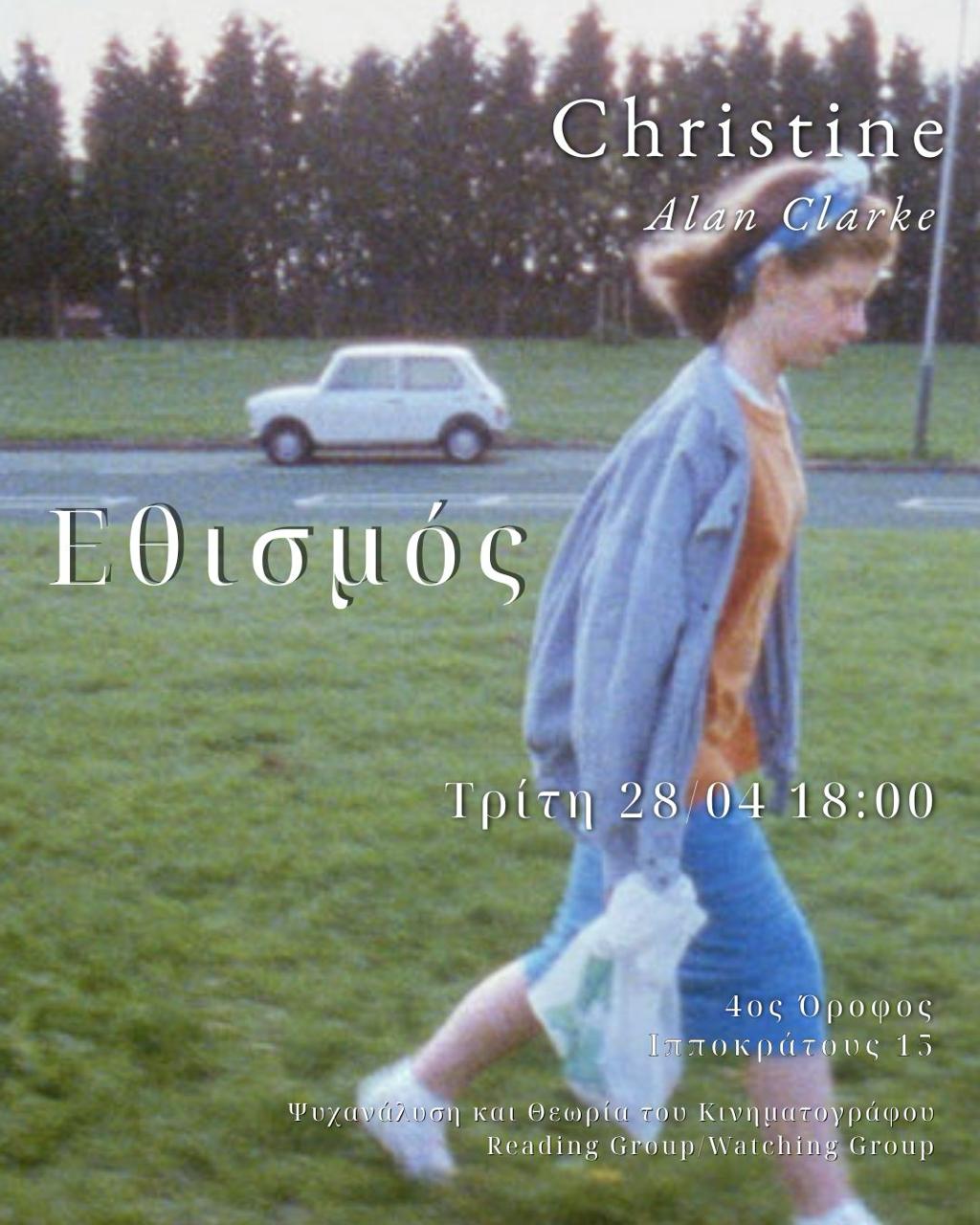 Ψυχανάλυση και Θεωρία του Κινηματογράφου: Reading/Watch Group. Ο εθισμός μέσα από γραπτά του David Foster Wallace και λακανική θεωρία και το Christine (1987) του Alan Clarke (ΔΕΝ γίνεται προβολή της ταινίας). Τρίτη, 28/4, 18:00, Ιπποκράτους 15, 4ος όροφος. Το υλικό μπορεί να ζητηθεί στο kinotheoryreading@gmail.com