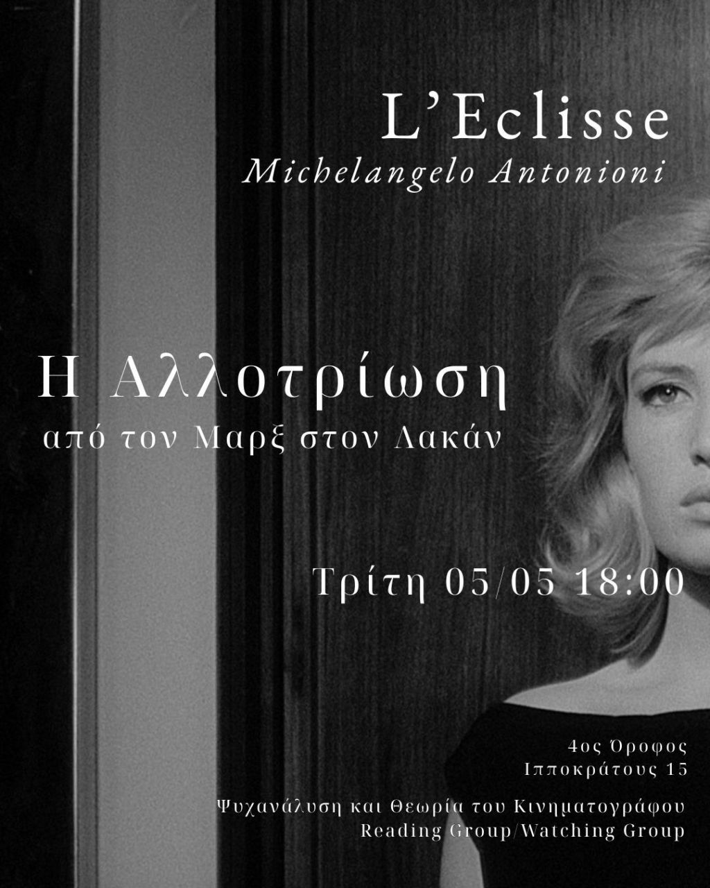 Ψυχανάλυση και Θεωρία του Κινηματογράφου: Reading/Watch Group. Η αλλοτρίωση από τον Μαρξ στον Λακάν με βάση αποσπάσματα από το Καπιταλιστικό Ασυνείδητο του Samo Tomsic και την Έκλειψη (1962) του Μικελάντζελο Αντονιόνι (ΔΕΝ γίνεται προβολή της ταινίας). Τρίτη, 5/5, 18:00, 4ος όροφος, Ιπποκράτους 15. Το υλικό μπορεί να ζητηθεί στο kinotheoryreading@gmail.com
