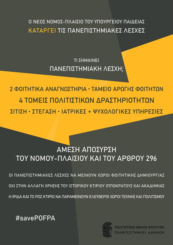 Πανεπιστημιακής Λέσχης του ΕΚΠΑ. Η συγκεκριμένη αλλαγή καταργεί την αυτοτέλεια της Λέσχης και, συνεπώς, την ανεξάρτητη διαχείριση των οικονομικών της αποθεμάτων, του προϋπολογισμού της,καθώς και των κτιριακών της υποδομών. Η λέσχη του ΕΚΠΑ στεγάζει διάφορες υπηρεσίες φοιτητικής μέριμνας (δύο φοιτητικά αναγνωστήρια, ταμείο αρωγής φοιτητών, σίτιση – στέγαση, ιατρικές υπηρεσίες και υπηρεσίες ψυχικής υγείας). Παράλληλα, στεγάζει και υποστηρίζει τον Πολιτιστικό Όμιλο Φοιτητών Πανεπιστημίου Αθηνών (Π.Ο.Φ.Π.Α.), ο οποίος δραστηριοποιείται για σχεδόν 100 χρόνια στα κτίρια της Ιπποκράτους 15, στο ισόγειο του οποίου βρίσκεται και το ιστορικό κινηματοθέατρο «Ίρις» και στο κτίριο «Κωστής Παλαμάς» στη γωνία των οδών Ακαδημίας και Μασσαλίας.